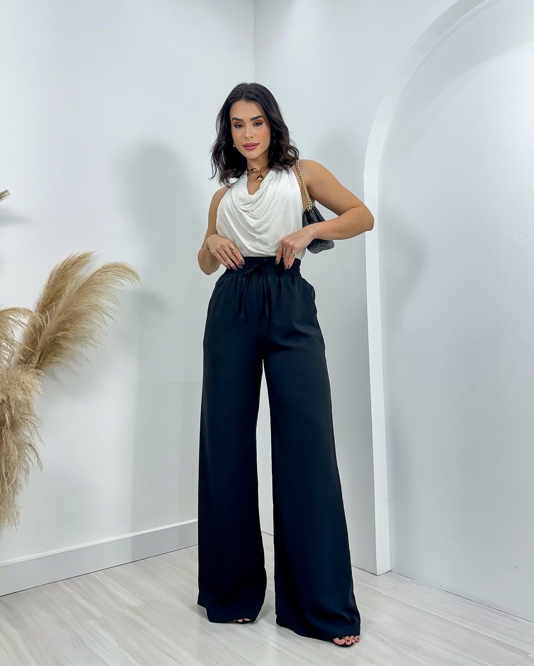 O preto é um clássico atemporal que nunca sai de moda, combinando facilmente com qualquer peça e estilo. Ideal para compor produções formais com camisas, blusas de seda ou tops sofisticados, a pantalona também se adapta a looks casuais com regatas ou croppeds. Seja para o trabalho, um evento especial ou momentos descontraídos, essa peça é indispensável no guarda-roupa feminino.