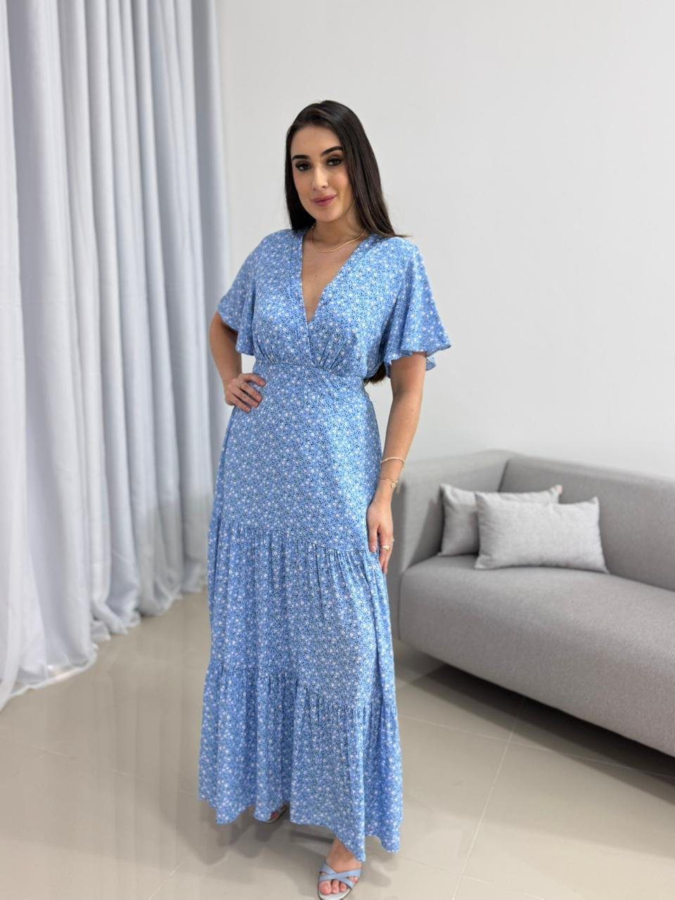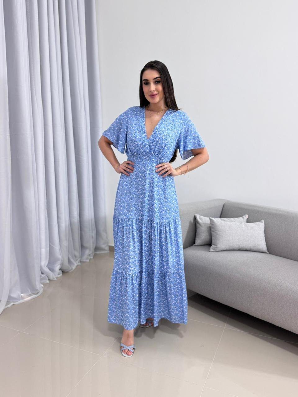 Vestido Longo Azul Floral – Manga Curta e Saia em Camadas