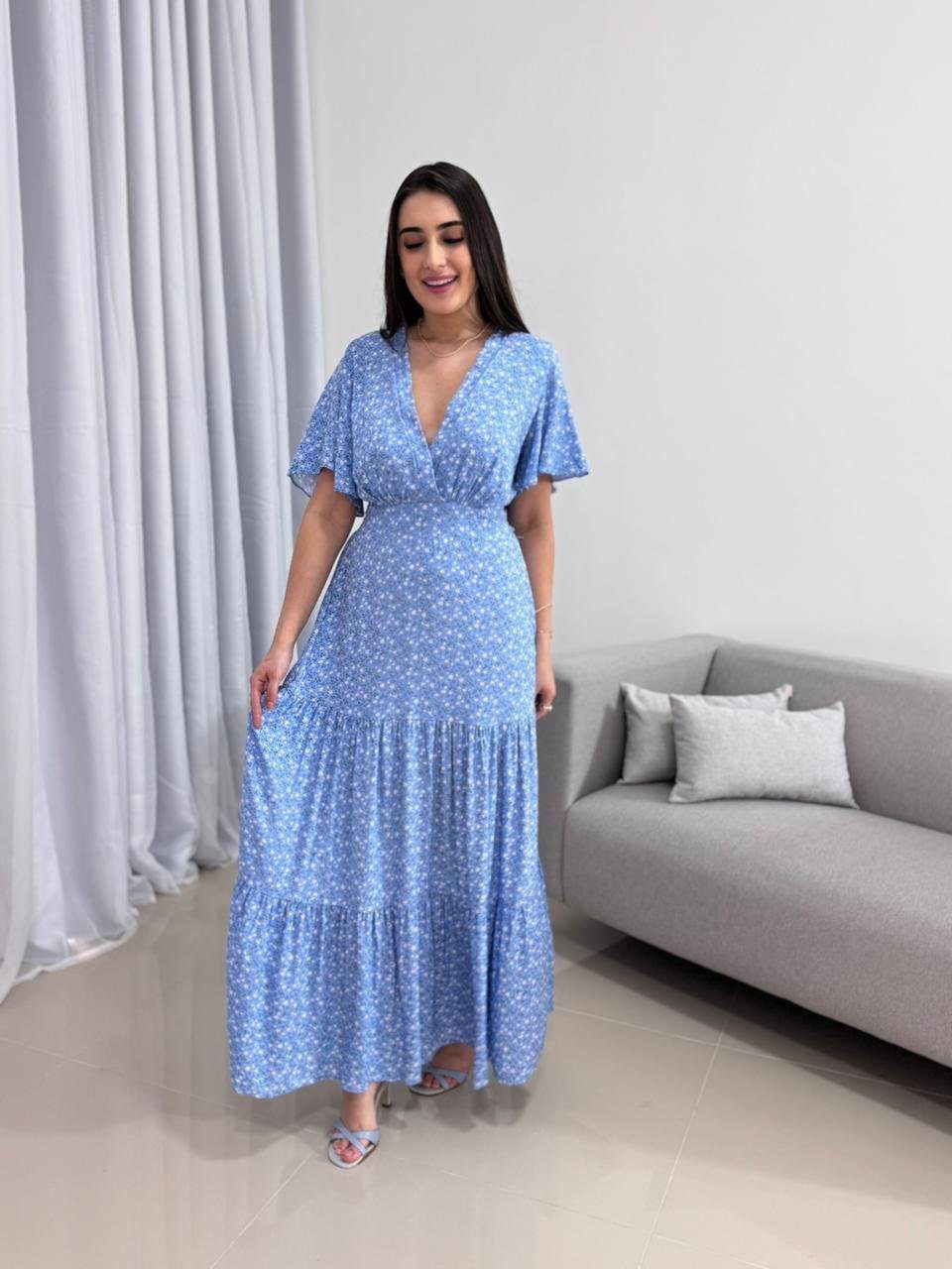 O Vestido Longo Azul Floral combina conforto, caimento impecável e feminilidade em uma peça leve, fresca e perfeita para o verão.